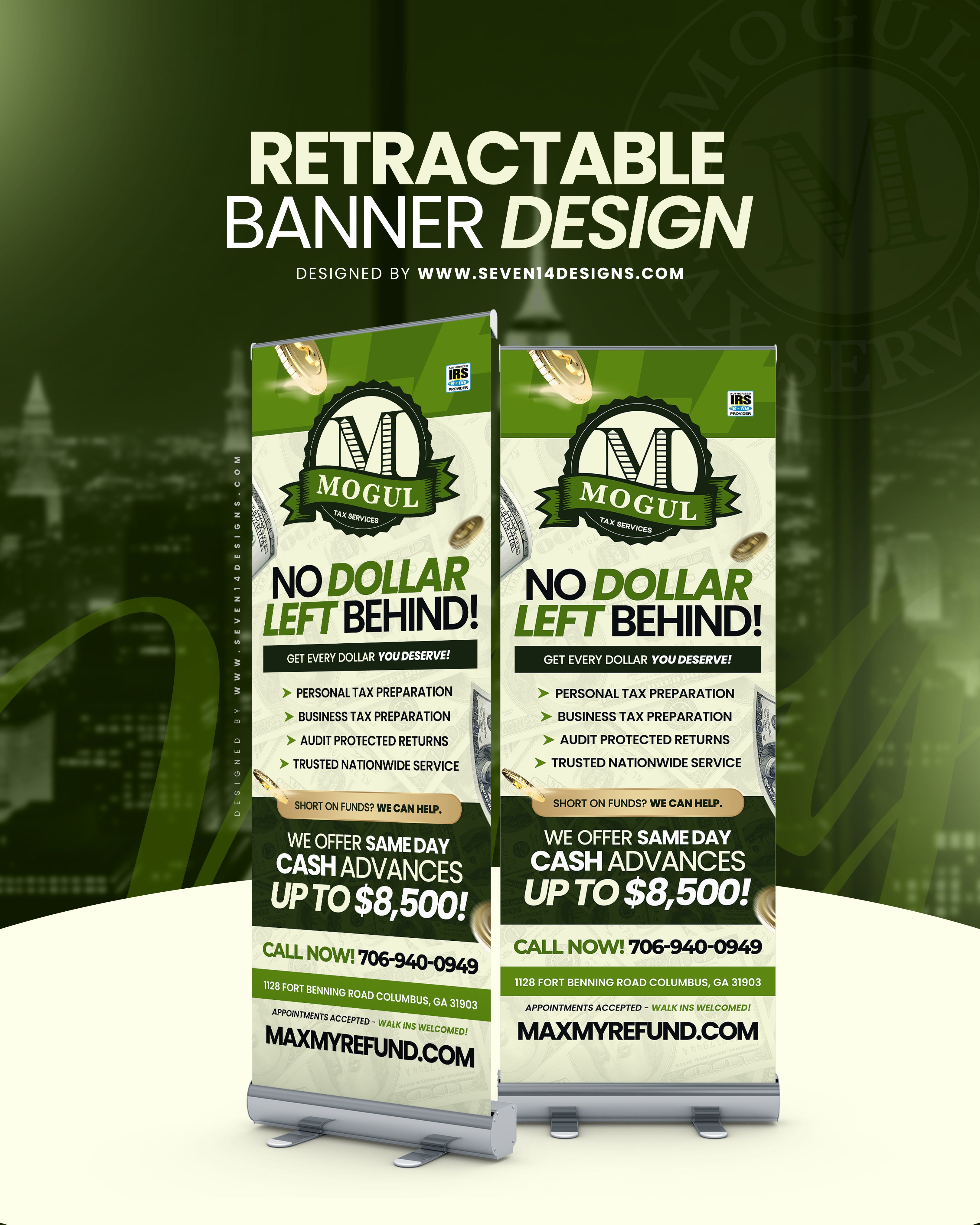 Client must provide exact retractable banner sizing if not wanting the standard size of 33"x81" as well as logo files, color hex codes, photos if applicable, all verbiage for banner including social media, website, phone number, etc.